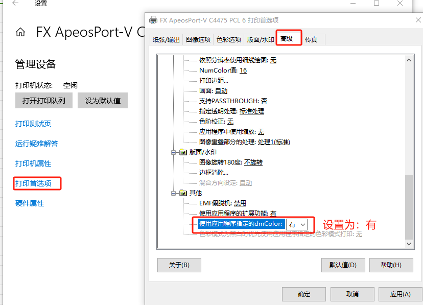 打开本地电脑上的施乐打印机首选项,点击高级,首选项,同步应用程序和驱动程序,保存后生效