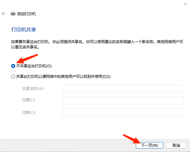 6、选择不共享打印机