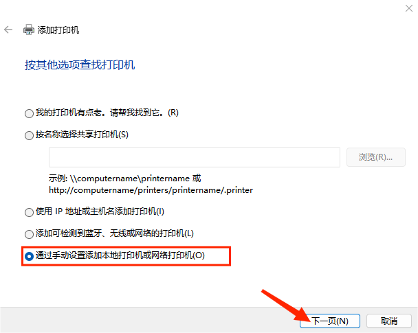 1、选择通过手动设置添加本地打印机或网络打印机