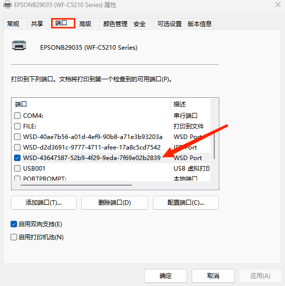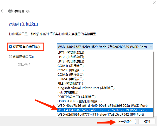 2、选择打印机端口需要与之前查看创建打印机副本端口相同