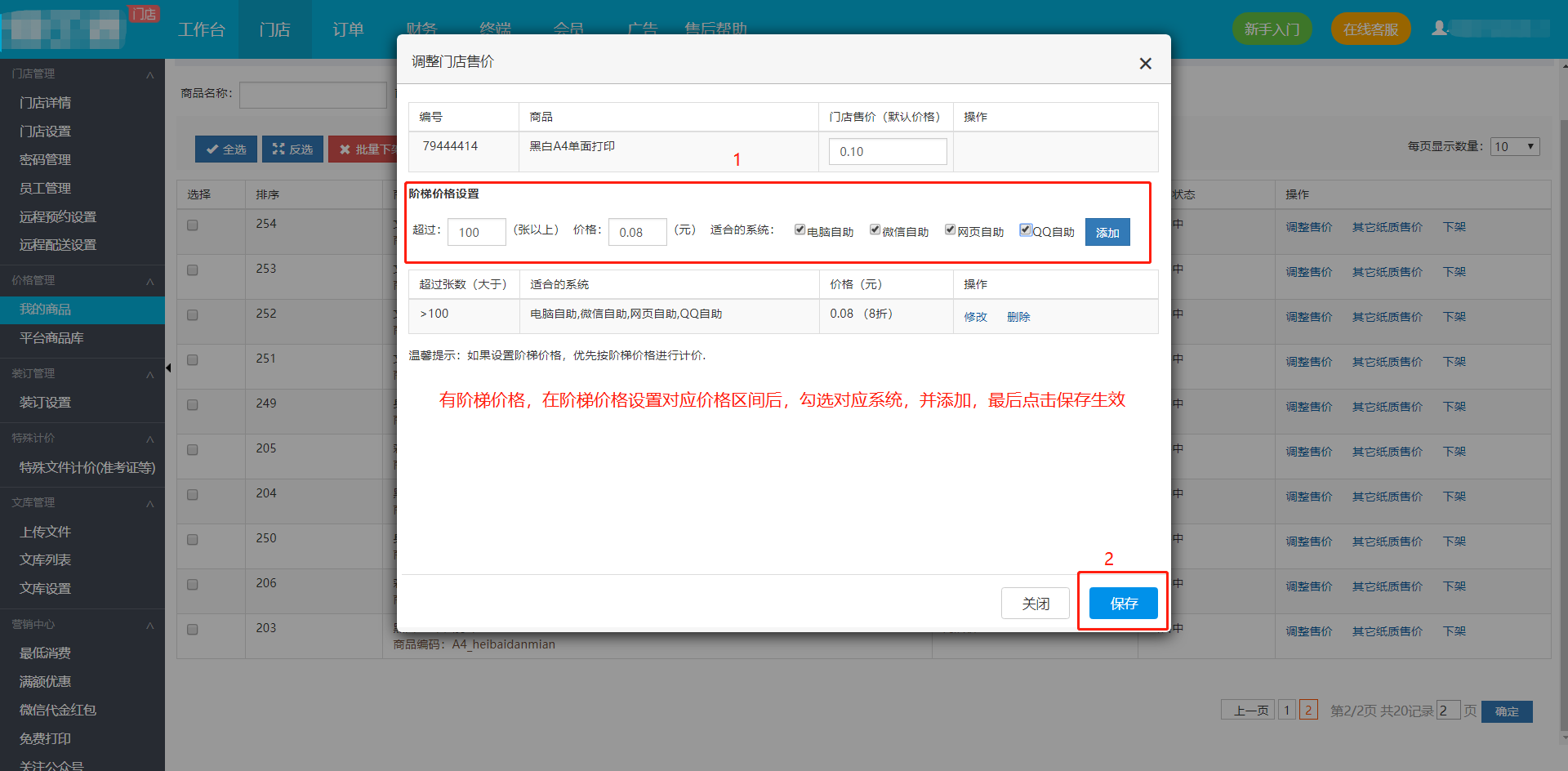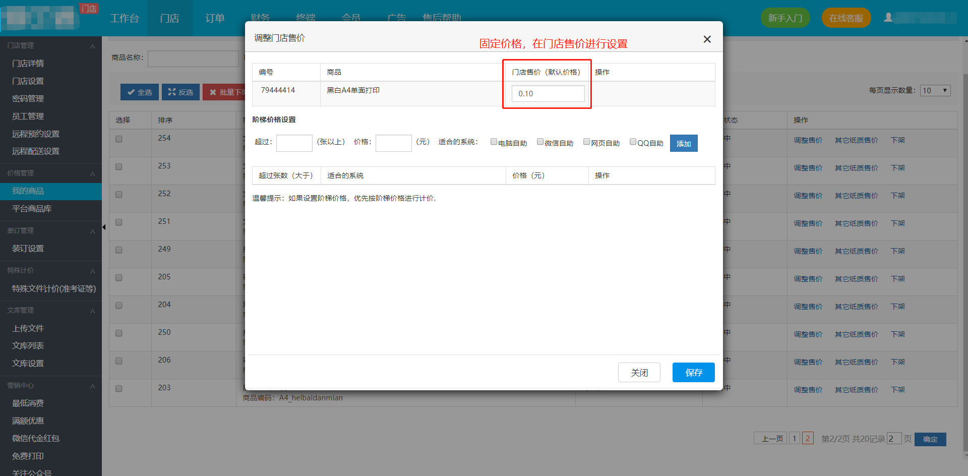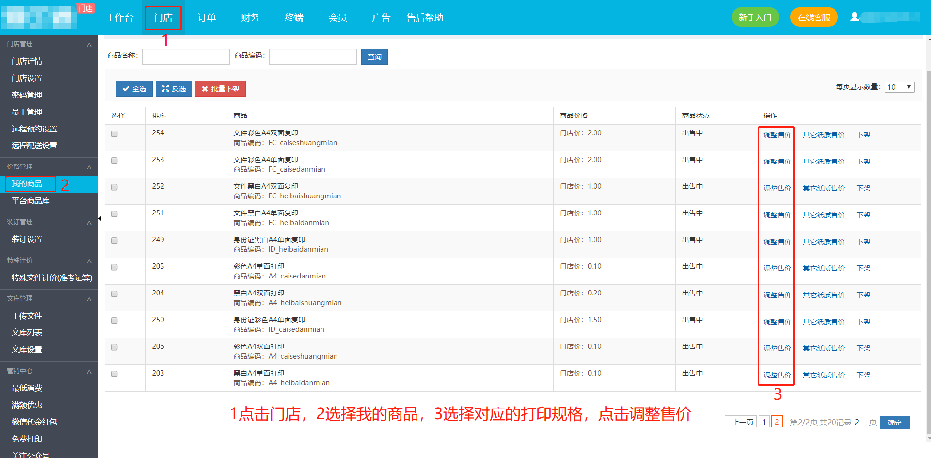 第一步,登陆后台,点击门店,点击我的商品,选择对应的打印规格点击调整售价