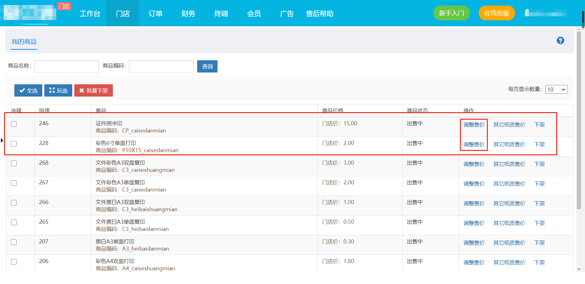 2、在后台门店菜单,我的商品里,选择证件照冲印进行调整售价,设置证件照冲印的三个价格并保存生效。