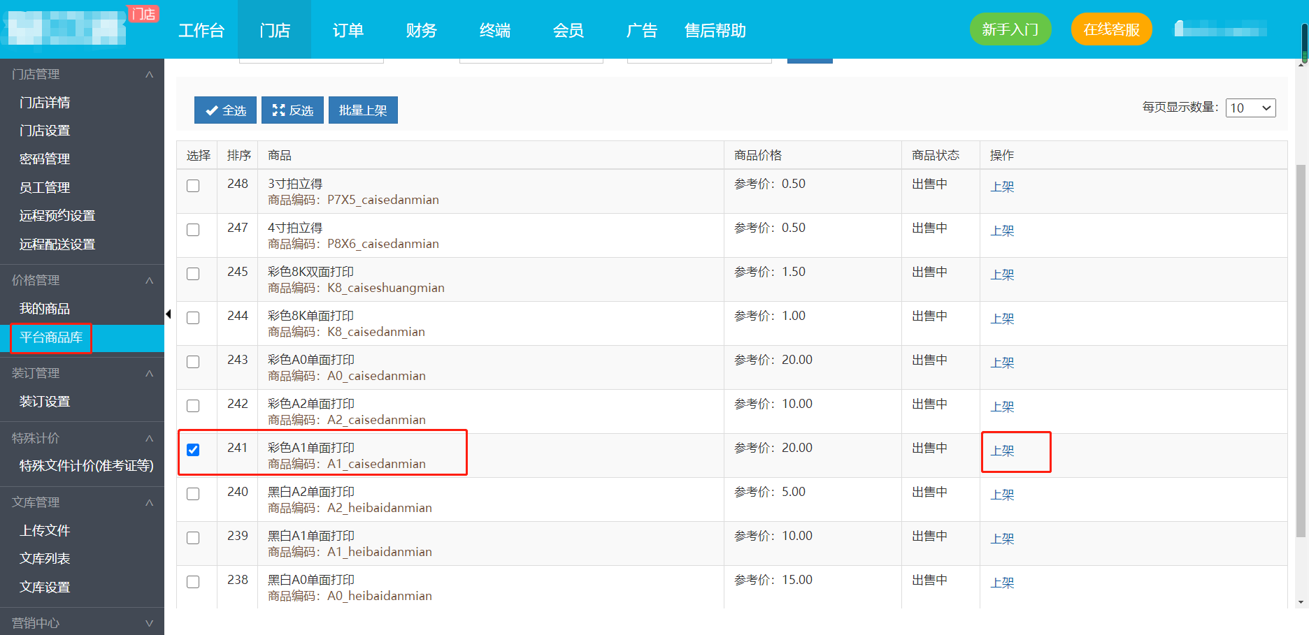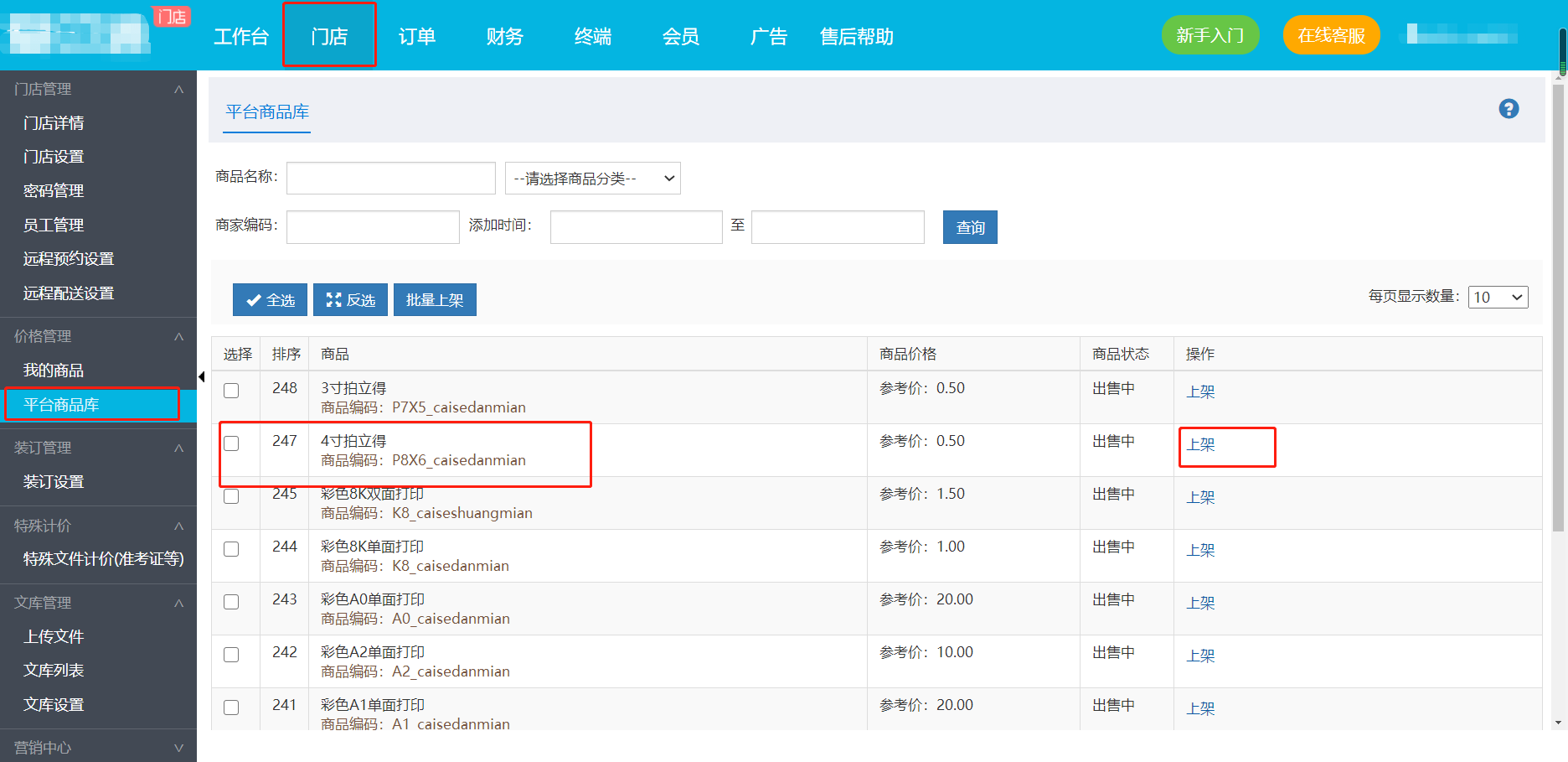 1、确保我的商品里有6寸彩色单面打印+证件照冲印两个商品,没有的话,在平台商品库进行上架。