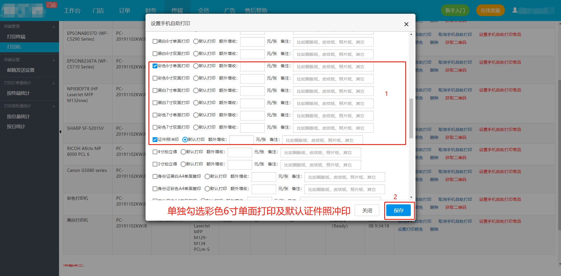 4,充值后,进行手机打印配置,点终端,选择对应照片打印机启用手机自助打印,并设置手机自助打印商品。在手机