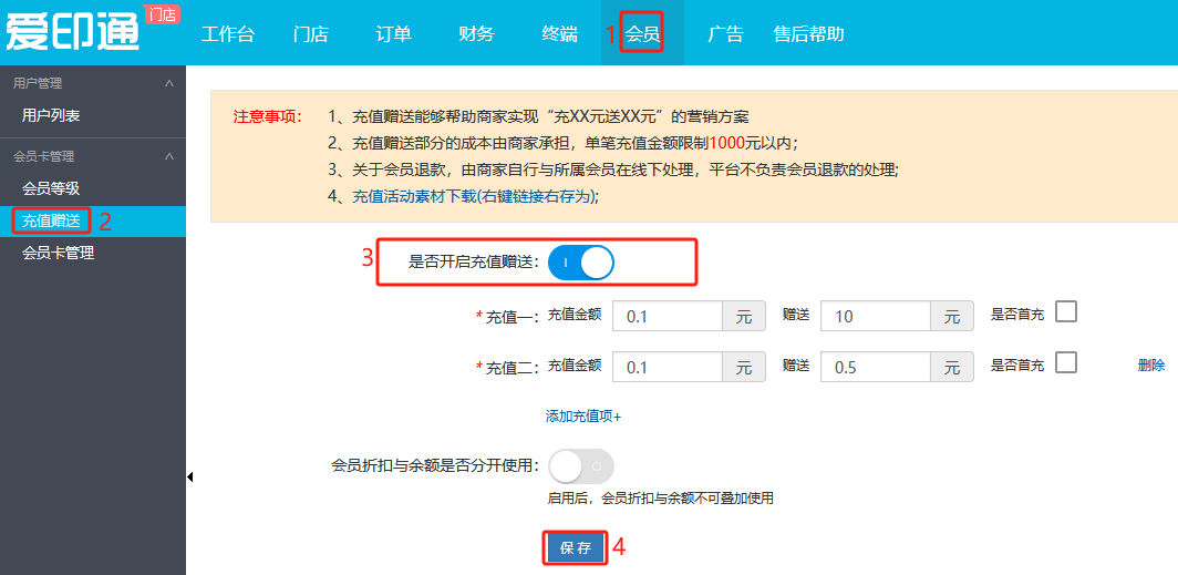 3、“是否开启充值赠送”点击开启,设置充值金额