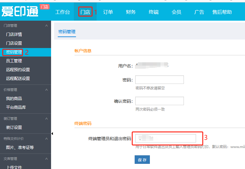 3、设置终端密码 ,点击“保存”