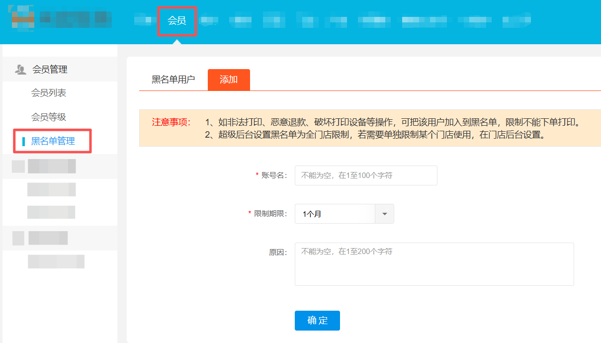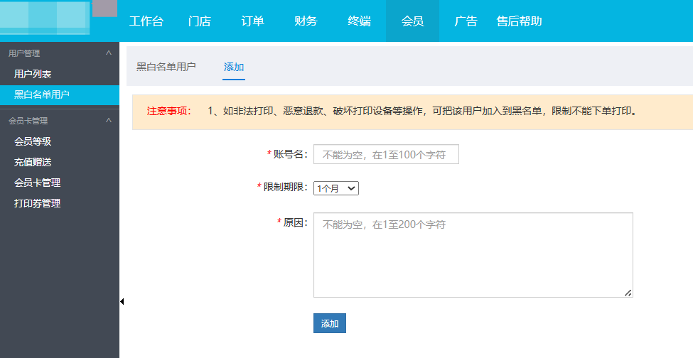 1、会员功能里面,选择黑名单管理,添加用户,进行全平台所有门店拉黑。