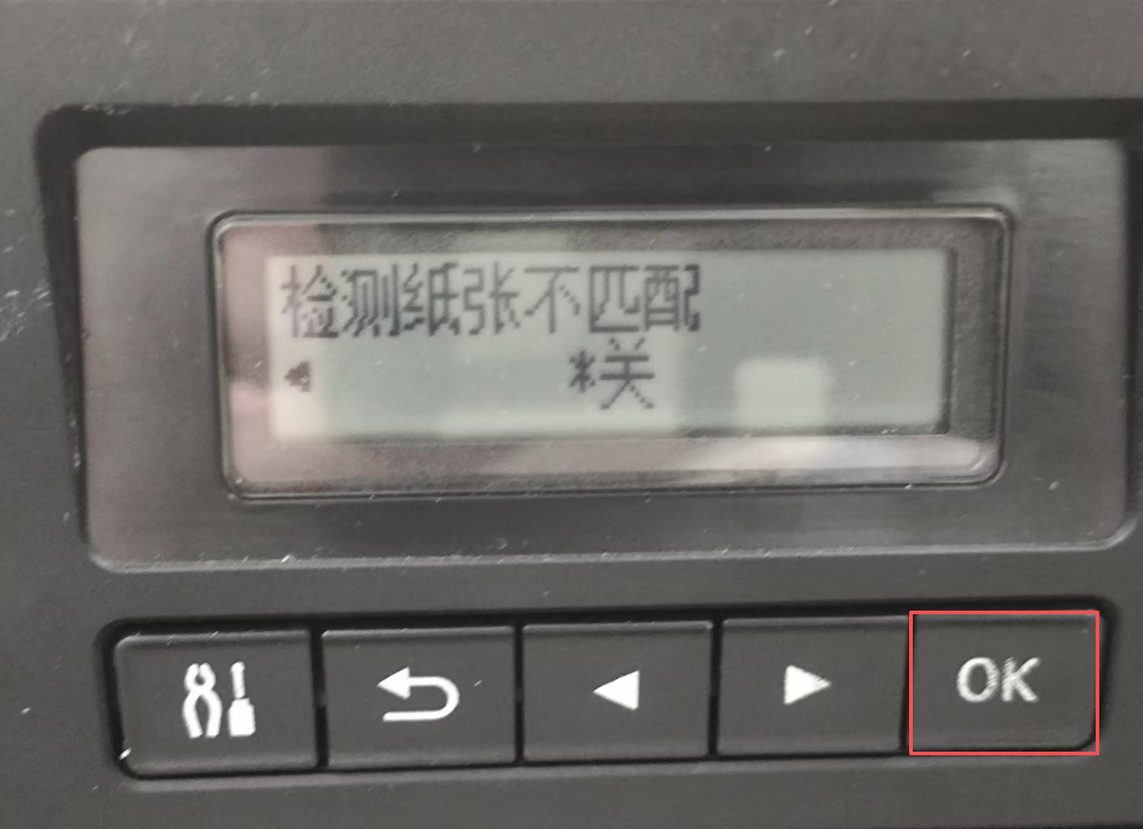 4、在检测纸张不匹配中“关””,按"OK"