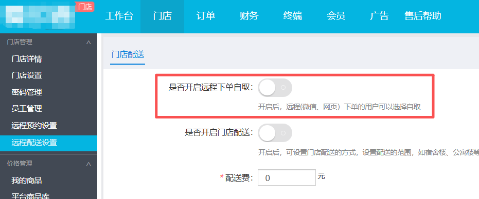第一步、进入网页后台,门店设置,远程配送设置,关闭远程自启