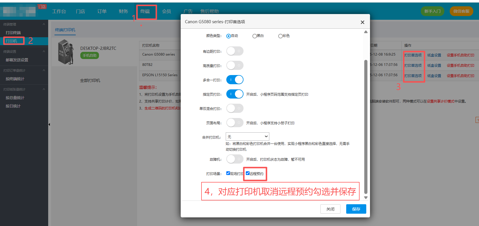 第二步、点击终端,选择打印机,选择需要关闭远程预约的打印机并点击打印机首选项,取消远程预约勾选并保存即可,全部打印机都需要关闭,则每个都要取消勾选保存