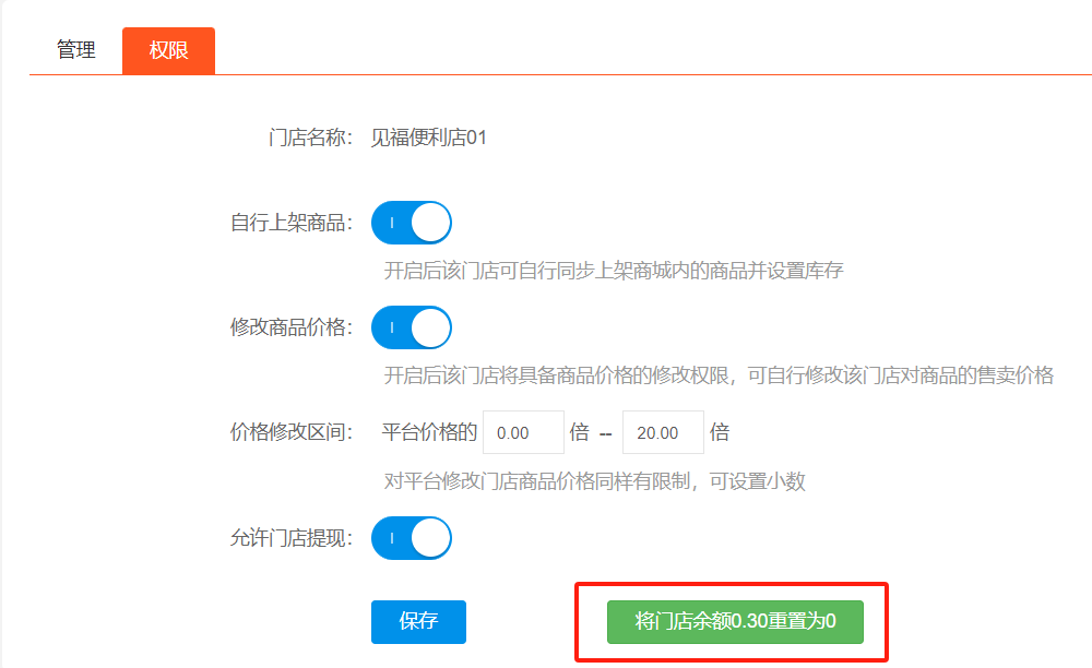 方法二:平台线下把钱转账给门店商家,然后超级后台搜索对应门店,点击权限,将门店余额重置为0