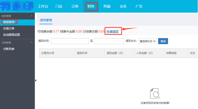 方法一:门店后台,财务,提现管理,申请提现,然后超级后台把这笔提现申请结算掉