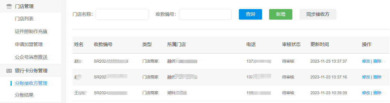 3、客户提交后的信息,信息会自动同步到超级后台---门店---分账接收方管理列表里面,等待审核状态变为 “通过” ,即分账添加成功并启用