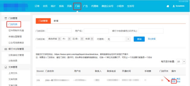1、进入超级后台,对应门店点击编辑按钮,开启银行卡结算