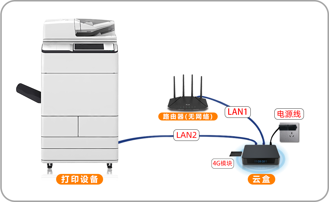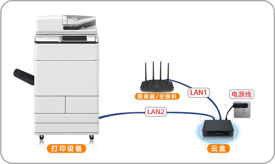 - LAN2接“打印机设备” 注意事项:打印机网线必须连LAN2,如果其它打印设备在同一局域网,也可添加管控