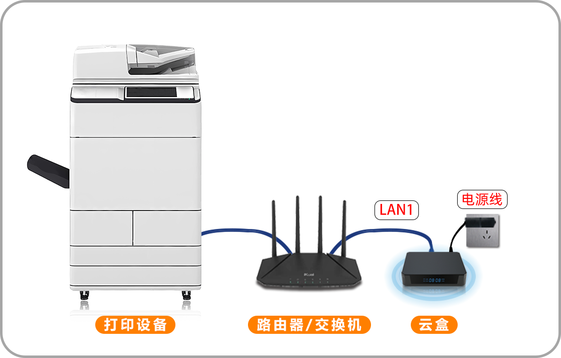 - 云盒跟打印机设备连接同一个路由器/交换机设备下